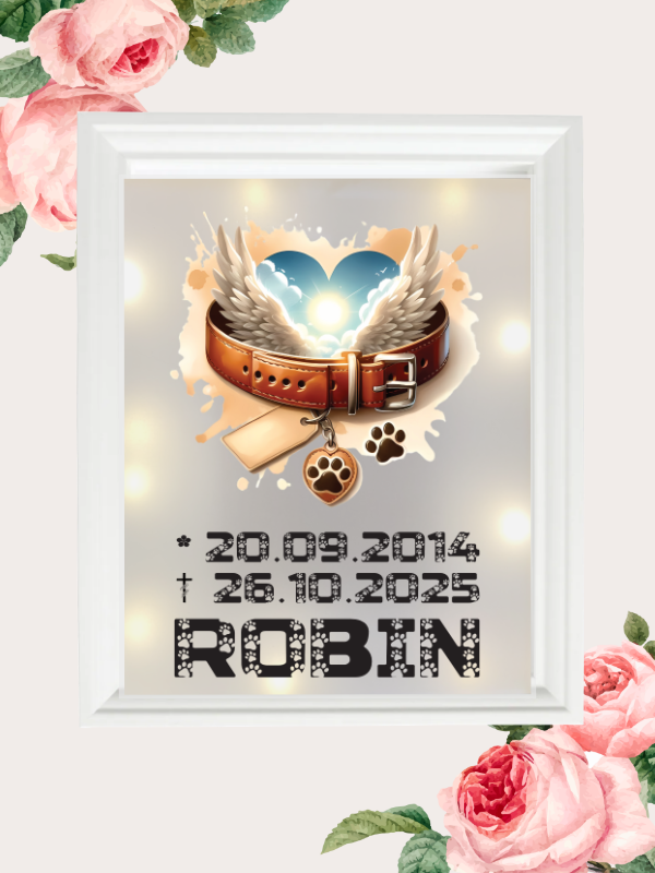 Halten Sie die Erinnerung an Ihre geliebte Fellnase für immer lebendig! Mit unseren liebevoll gestalteten Produkten – einer Kissenhülle und einem Leuchtrahmen – schaffen Sie einen besonderen Ort des Gedenkens an Ihren Hund. Beide Designs bieten Platz für die wichtigsten Details: den Namen, das Geburtsdatum sowie das Datum des Abschieds. Diese einzigartigen Erinnerungsstücke kombinieren stilvolle Optik mit emotionalem Wert und helfen Ihnen dabei, die schönsten Momente mit Ihrem treuen Begleiter im Herzen zu bewahren.