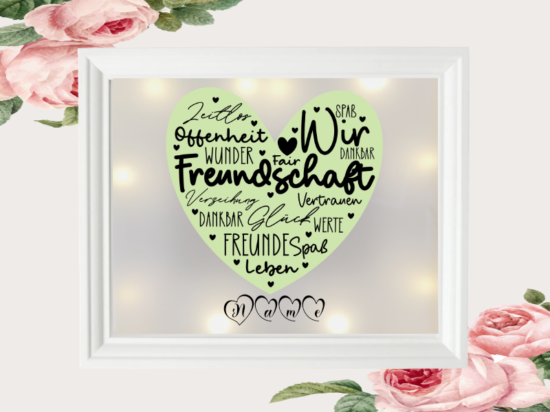 Kissenhülle & Leuchtrahmen mit Spruch – Herz aus Worten mit Name