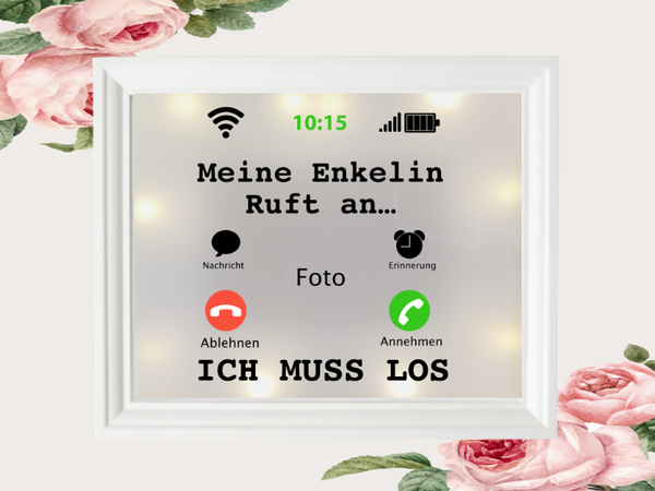 Kissenhülle & Leuchtrahmen mit Spruch – "Meine Enkelin ruft an… mit Foto"
