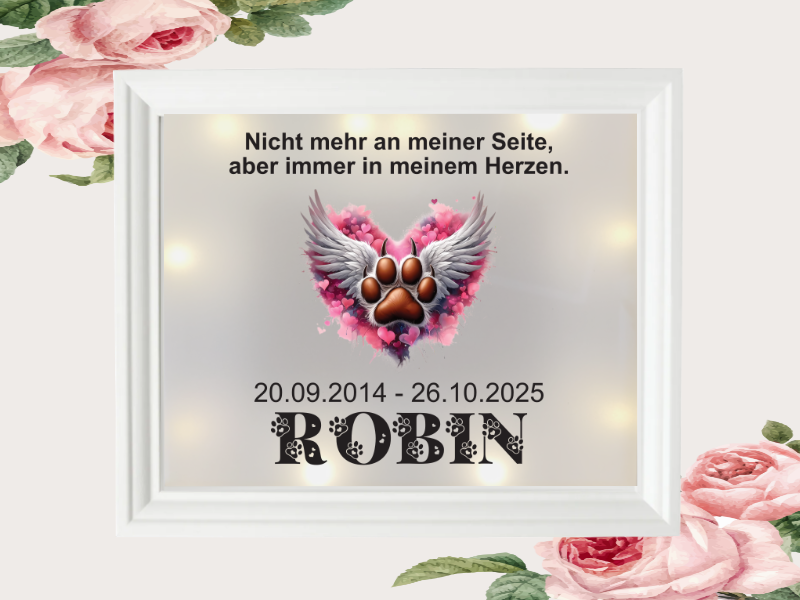 Ein treuer Begleiter hinterlässt Spuren im Herzen, die für immer bleiben. Unsere liebevoll gestalteten Kissenhülle und Leuchtrahmen helfen Ihnen, die Erinnerung an Ihre Fellnase auf eine besondere Weise festzuhalten. Mit der Inschrift "Nicht mehr an meiner Seite, aber immer in meinem Herzen" tragen diese Produkte dazu bei, die Liebe und die schönen Momente zu bewahren. Personalisieren Sie Ihre Erinnerungsstücke mit den Daten Geboren am, Gestorben am und dem Namen Ihrer Fellnase, um eine einzigartige und ewige Gedenkstätte zu schaffen.