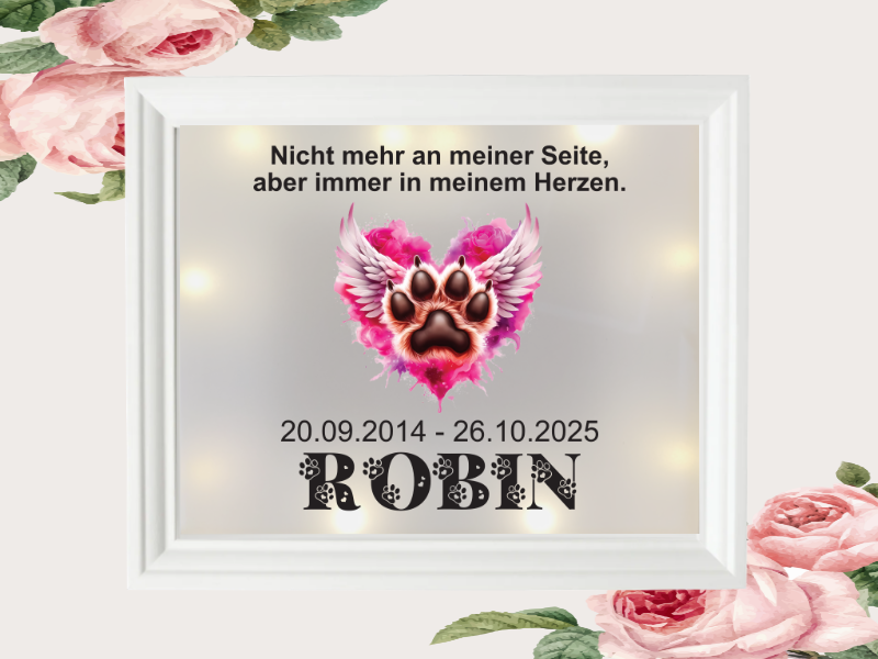 Ein treuer Begleiter hinterlässt Spuren im Herzen, die für immer bleiben. Unsere liebevoll gestalteten Kissenhülle und Leuchtrahmen helfen Ihnen, die Erinnerung an Ihre Fellnase auf eine besondere Weise festzuhalten. Mit der Inschrift "Nicht mehr an meiner Seite, aber immer in meinem Herzen" tragen diese Produkte dazu bei, die Liebe und die schönen Momente zu bewahren. Personalisieren Sie Ihre Erinnerungsstücke mit den Daten Geboren am, Gestorben am und dem Namen Ihrer Fellnase, um eine einzigartige und ewige Gedenkstätte zu schaffen.