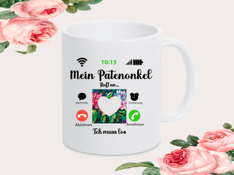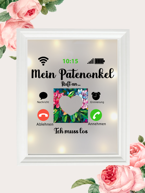 Sie suchen ein außergewöhnliches Geschenk, das persönlich und humorvoll zugleich ist? Entdecken Sie unsere individuell gestaltbaren Produkte mit dem Spruch: "Mein Patenonkel ruft an… Ich muss los!" – kombiniert mit Ihrem persönlichen Foto! Unsere liebevoll entworfene Kissenhülle sorgt für kuschelige Momente, während der Leuchtrahmen Ihr Zuhause stilvoll erhellt. Die Tasse mit diesem einzigartigen Spruch bringt nicht nur ein Lächeln, sondern auch Persönlichkeit in den Alltag. Jedes Produkt wird mit Ihrem Foto individuell angefertigt und ist damit ein echtes Unikat – perfekt als Geschenk oder um sich selbst eine Freude zu machen!