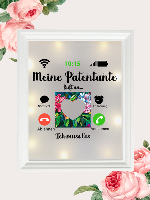 Suchen Sie nach einem persönlichen und originellen Geschenk für Ihre Patentante? Unsere liebevoll gestalteten Produkte mit dem Spruch „Meine Patentante ruft an… Ich muss los“ und einem persönlichen Foto sind die perfekte Wahl! Ob eine weiche Kissenhülle für entspannte Stunden, ein stilvoller Leuchtrahmen für stimmungsvolle Akzente oder eine praktische Tasse für den täglichen Gebrauch – jedes dieser Geschenke zeigt auf charmante Weise Ihre besondere Wertschätzung. Die Kombination aus witzigem Spruch und persönlichem Foto macht diese Geschenke zu einem echten Hingucker und zu einem Highlight, das in Erinnerung bleibt. Bestellen Sie jetzt und überraschen Sie Ihre Patentante mit einem liebevoll gestalteten Unikat!