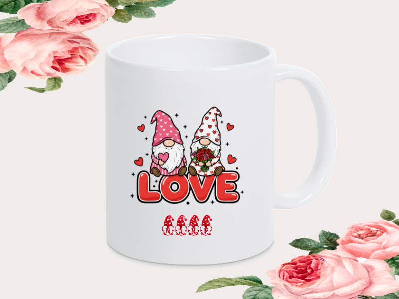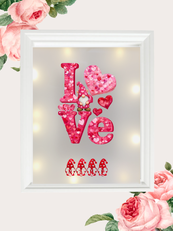 Personalisierte Geschenke: Kissenhülle, Leuchtrahmen & Tasse mit dem Motiv "Gnome Love"